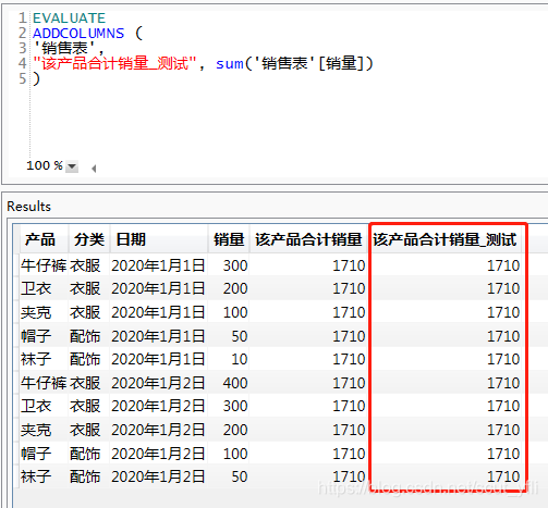 新增列的dax调试,使用ADDCOLUMNS 模拟进行,格式如下: