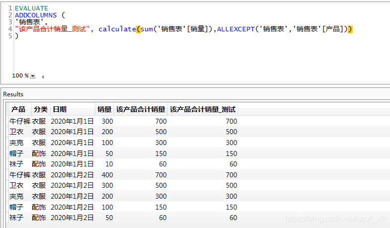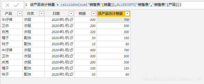 修改如下就符合我们设定的预期了,比如第一行的牛仔裤,在该产品合计销量列,就只累计了牛仔裤在1月1日、1月2日的销量。