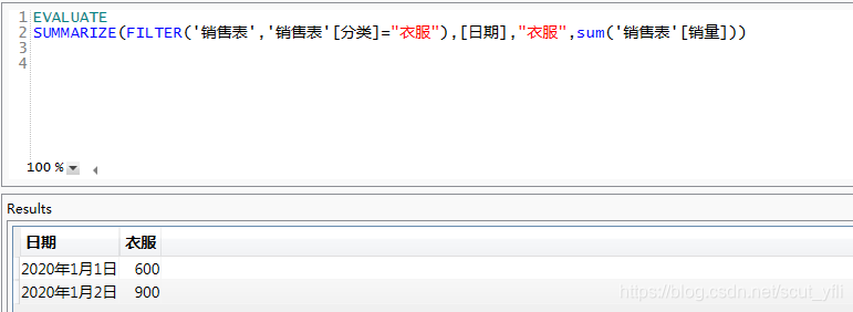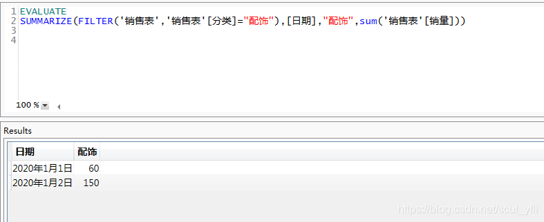 SUMMARIZE(FILTER('销售表','销售表'[分类]="配饰"),[日期],"配饰",sum('销售表'[销量]))