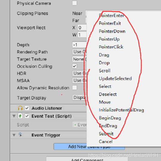 a:在物体上添加EventTrigger组件,点击AddNewEventType,然后选择需要的事件类型,然后点击加号,把带有自己写的脚本的物体拖入Object,选择自己定义的函数,然后点击时就会触发。