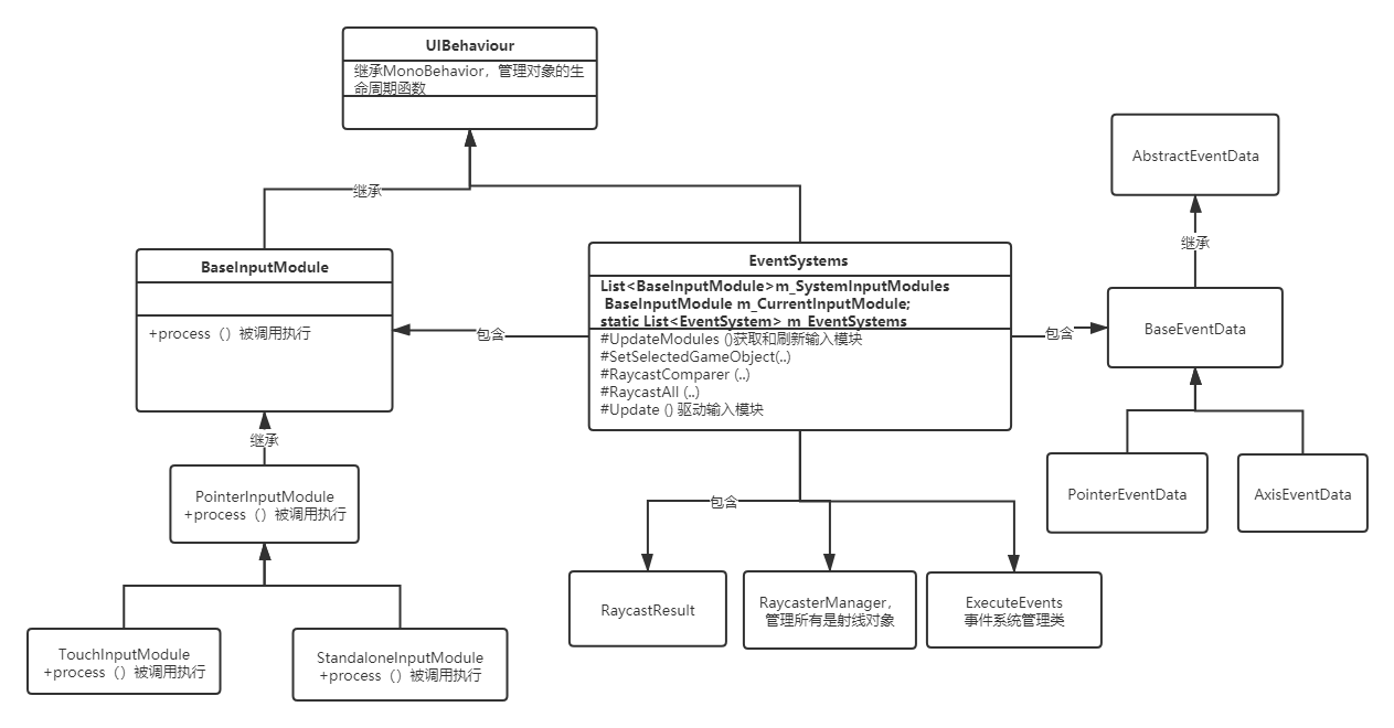 BaseInputModule:负责发送输入事件(点击、拖拽、选中等)到具体对象,OnEnable和OnDisable方法中,会更新EventSystem的InputModule。
