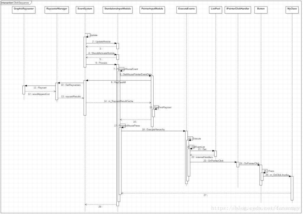 一个完整的事件流程:通过EventSystem管理,BaseInputModule输入,BaseRaycaster确定目标对象,目标对象负责接收事件并处理。