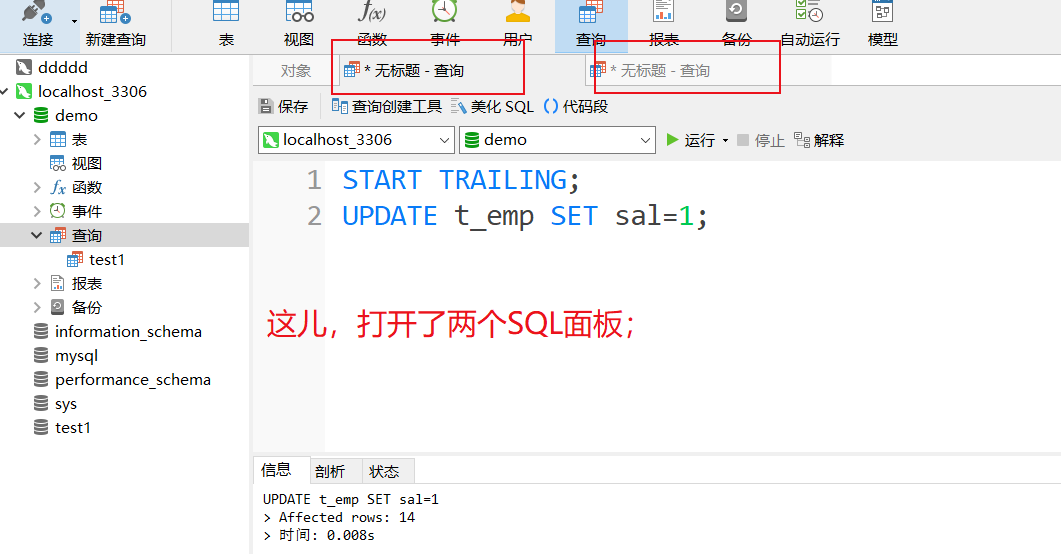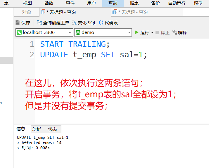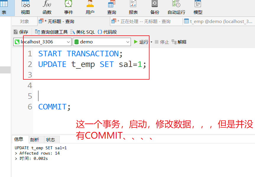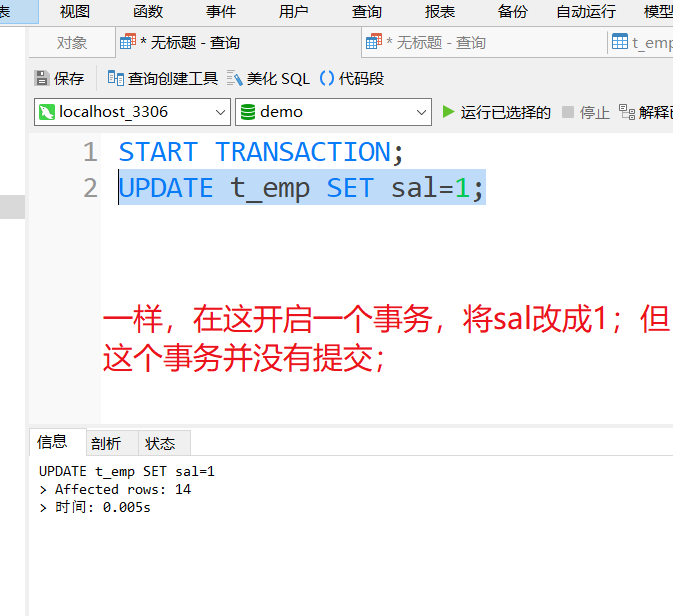 其中,“SET SESSION”意思是,设置当前会话的事务隔离级别;这种设置不是全局的,只在当前会话生效;会话的意思是:在Navicat中打开一个SQL面板,编写SQL语句,这个就是一个会话,当把这个面板关了,这个会话就结束了;