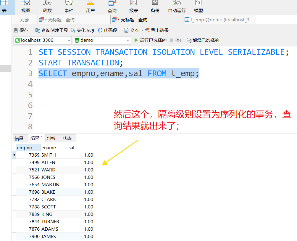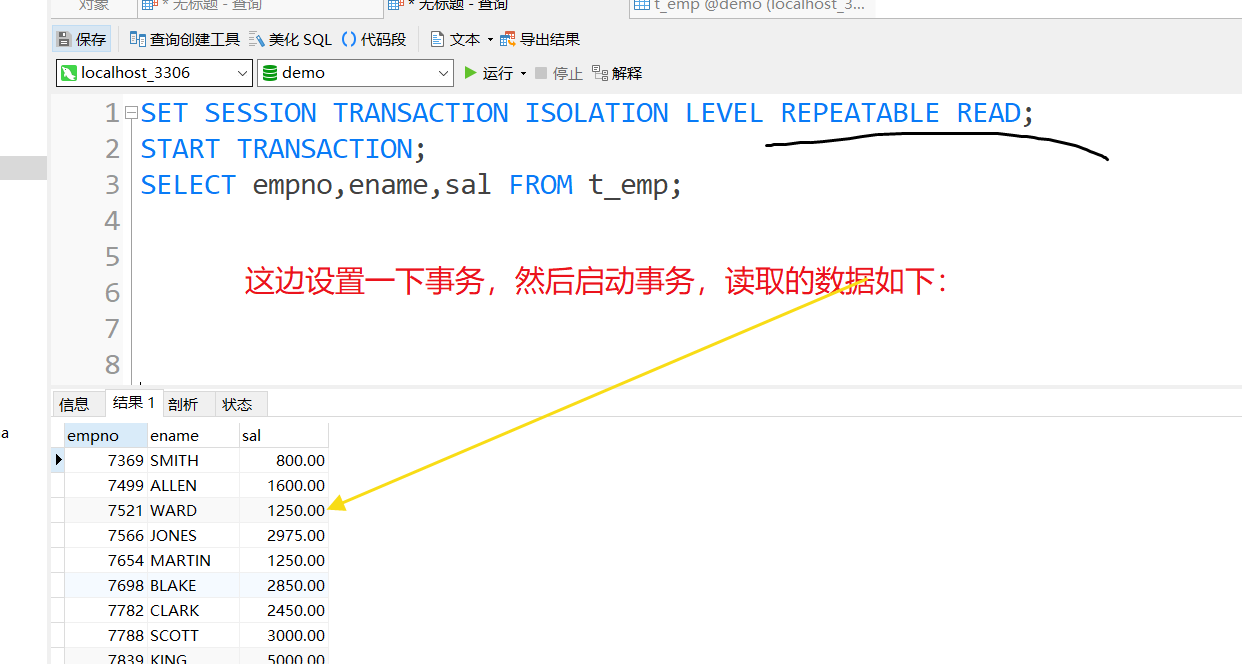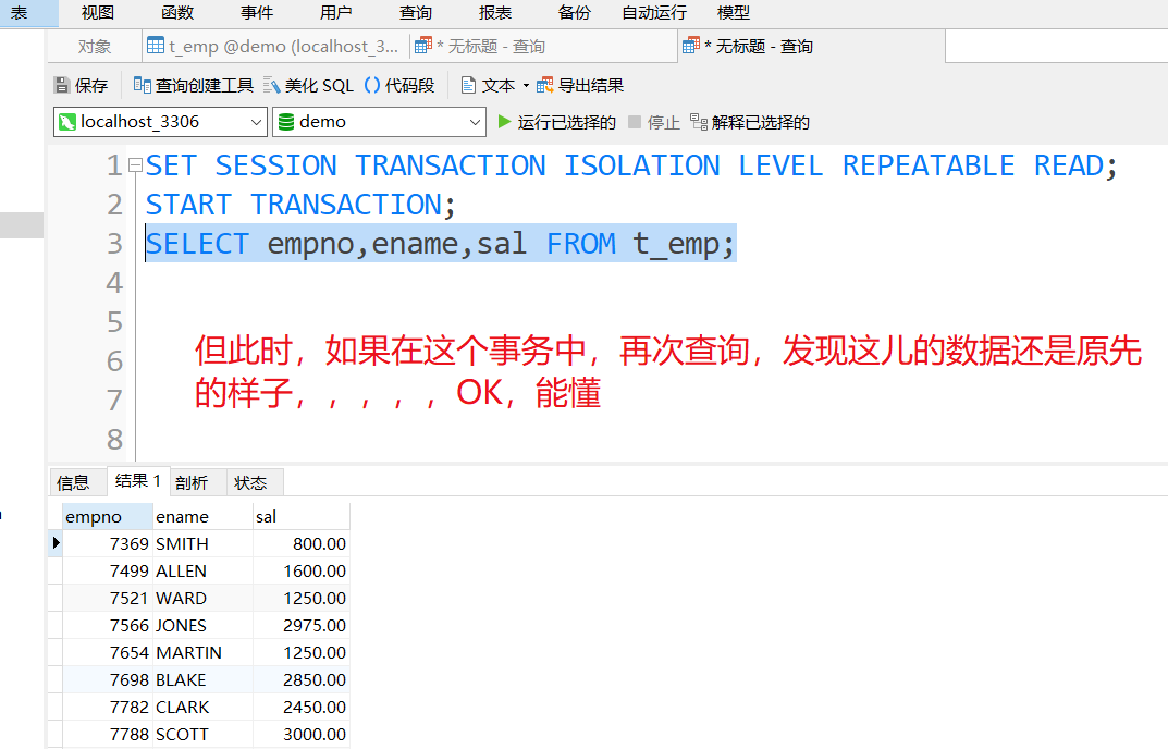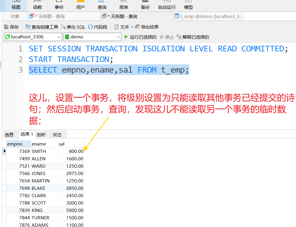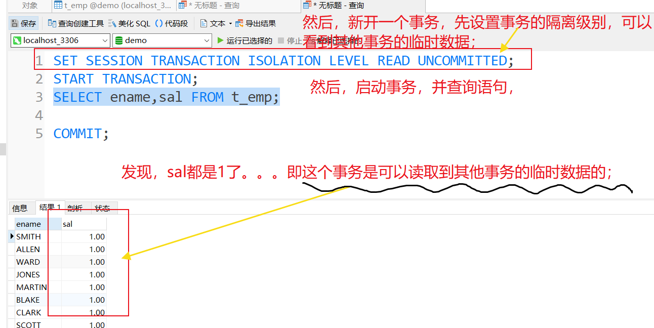 下面需要说明一点:一个事务在执行select操作之后,才能把数据表中的数据copy到undo日志中;;;即下面的事务,如果在【上面的将sal设置为1的事务】提交之前没有select,当【上面的将sal设置为1的事务】提交之后,下面这个事务再第一次执行select的话,其查询的结果就是sal已经被设置为1的t_emp表的数据了;(好吧,undo日志和redo日志的原理需要了解一下。。。。)