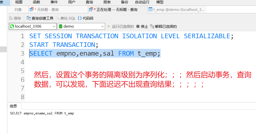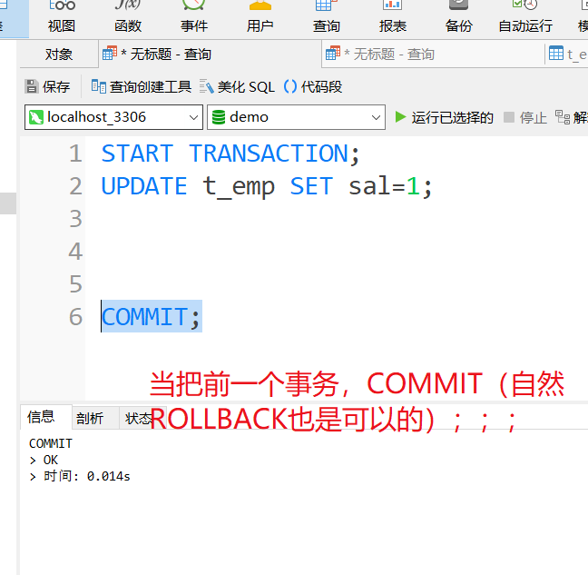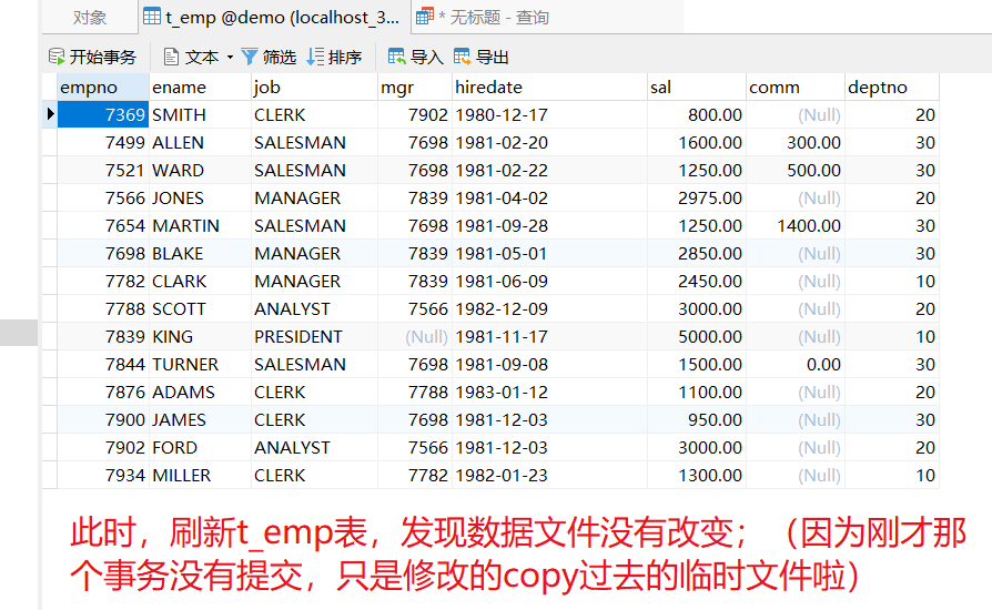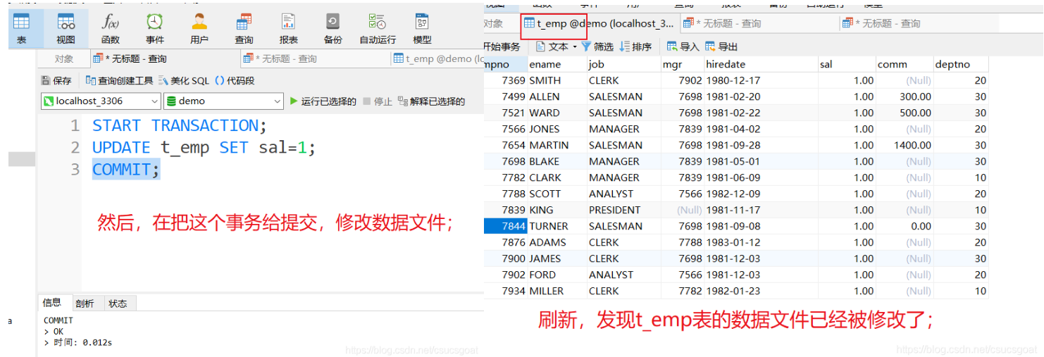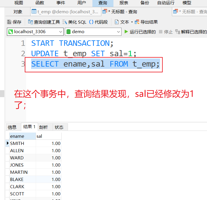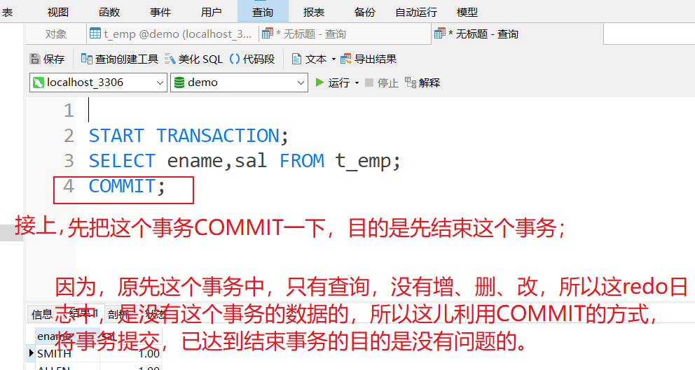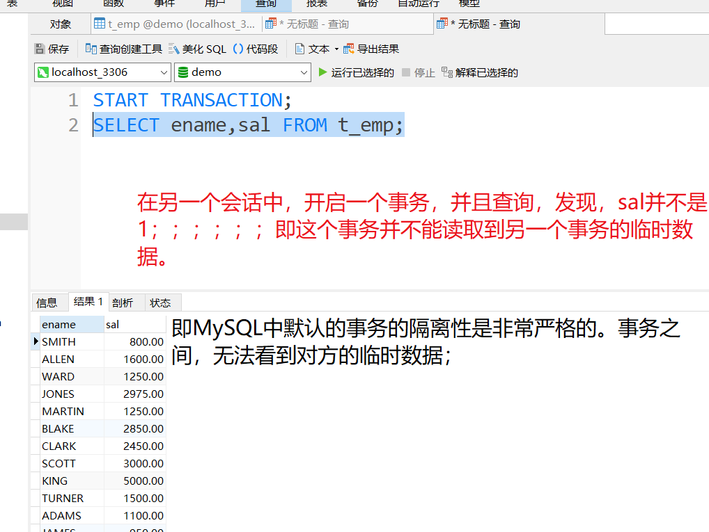 下面需要说明一点:一个事务在执行select操作之后,才能把数据表中的数据copy到undo日志中;;;即下面的事务,如果在【上面的将sal设置为1的事务】提交之前没有select,当【上面的将sal设置为1的事务】提交之后,下面这个事务再第一次执行select的话,其查询的结果就是sal已经被设置为1的t_emp表的数据了;(好吧,undo日志和redo日志的原理需要了解一下。。。。)