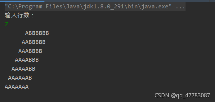 public static void main(String[] args) {System.out.println("输入行数:");Scanner scanner = new Scanner(System.in);int n = scanner.nextInt();for (int i = 0; i < n; i++) {for (int j = n - 1; j > i; j--) {System.out.print(" ");}for (int k = 0; k < i + 1; k++) {System.out.print("A");}for (int j = n-1; j >i; j--) {System.out.print("B");}System.out.println();}}