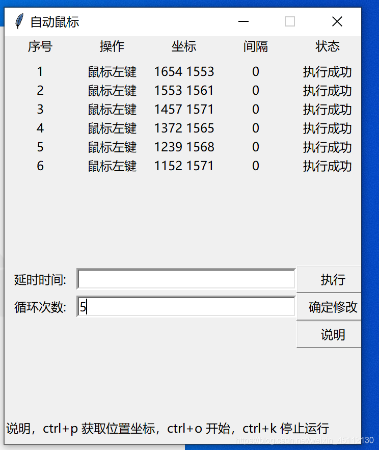 round_count = tk.StringVar()def catch(event):global index_iindex_i += 1dictvalue = [index_i,'鼠标左键',auto.position(),delay_time,'执行成功']names['n' + str(index_i)] = dictvaluefor j in range(0,5):tk.Label(frm2, text=dictvalue[j], width=9).grid(row=index_i, column=j)print(dictvalue)return index_i