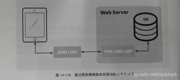 如前所述,在Unity中也可以通过ODBC连接数据库,但实际开发中会根据平台不同而有所区别。如图14-116所示,也可通过Web服务器的服务器脚本(Server Side Script)连接到数据库并收发数据。各位熟知的PHP、ASP、JSP等都是服务器端脚本,实际开发中可用JSON、XML、CSV等格式收发数据。
