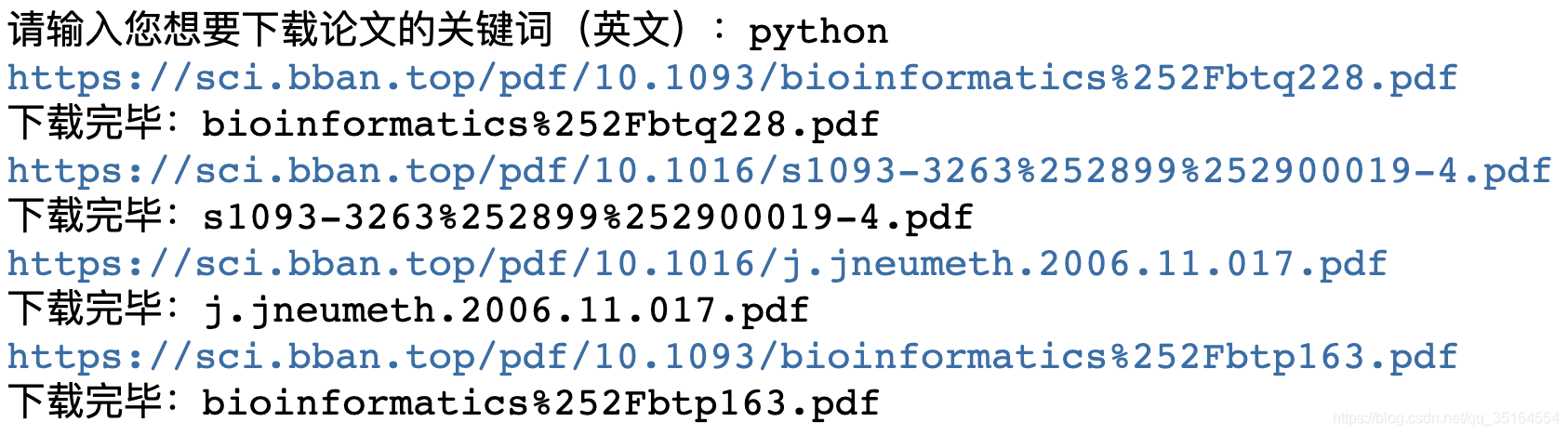 def doi_download(headers, key):doi_list = get_paper_link(headers, key)lst = []for i in doi_list:lst.append(list(i[0]))for i in lst:for j in range(8, len(i)):if i[j] == '/':i[j] = '%252F'elif i[j] == '(':i[j] = '%2528'elif i[j] == ')':i[j] = '%2529'else:i[j] = i[j].lower()for i in range(len(lst)):lst[i] = ''.join(lst[i])for doi in lst:down_link = 'https://sci.bban.top/pdf/' + doi + '.pdf'print(down_link)file_name = doi.split('/')[-1] + '.pdf'try:with open(file_name, 'wb') as f:r = requests.get(url=down_link, headers=headers)f.write(r.content)print('下载完毕:' + file_name)except:print("该文章为空")pass