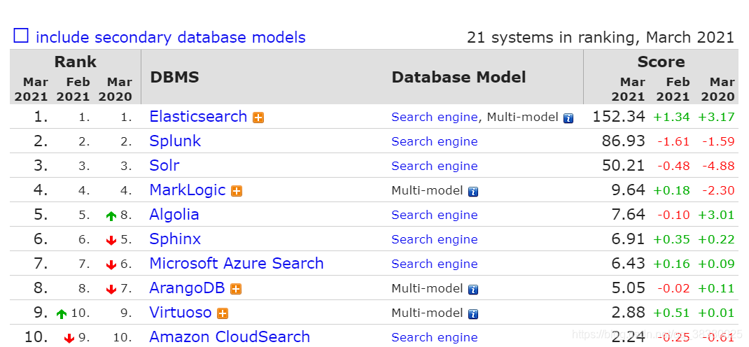 DB-Engines(一家收集和统计数据库管理系统信息的机构,网址:https://db-engines.com/en/ranking/search+engine)上的搜索引擎排名: