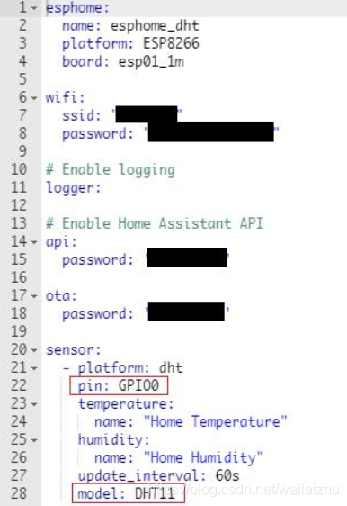 pin这个地方是你DHT11连接esp模块的引脚号,可以用D3,也可以用GPIO14,model是你使用的DHT模块型号。