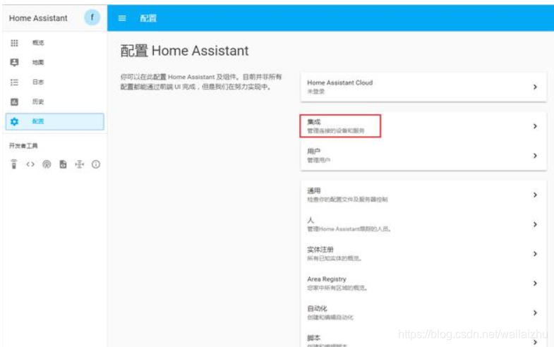 我们的传感器已经成功接入网络,现在我们需要把它和homeassistant连接起来。浏览器输入homeassistan的IP地址打开homeassistant,选中配置选项,再点击集成。