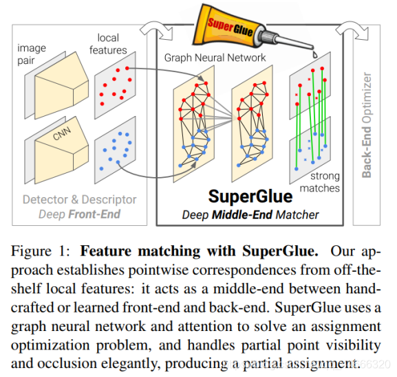 图 1:使用 SuperGlue进行特征匹配。我们的方法从当前的局部特征建立逐点对应关系:它充当人工或学习的前端和后端之间的中间端。SuperGlue使用图神经网络和注意力来解决分配优化问题,并处理部分点可见性并优雅地遮挡,产生部分分配。