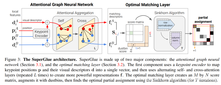 整个框架由两个主要模块组成:注意力GNN以及最优匹配层。其中注意力GNN将特征点以及描述子编码成为一个向量(该向量可以理解为特征匹配向量),随后利用自我注意力以及交叉注意力来回增强(重复L次)这个向量f的特征匹配性能;随后进入最优匹配层,通过计算特征匹配向量的内积得到匹配度得分矩阵,然后通过Sinkhorn算法(迭代T次)解算出最优特征分配矩阵。