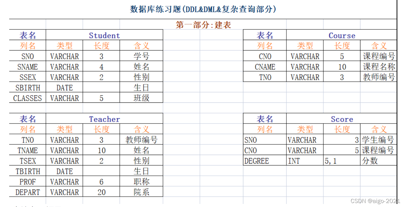 本文主要是介绍【SQL练习】创建表格结构,执行查询语句(DDL和DML查询部分),希望对大家解决编程问题提供一定的参考价值,需要的开发者们随着小编来一起学习吧!