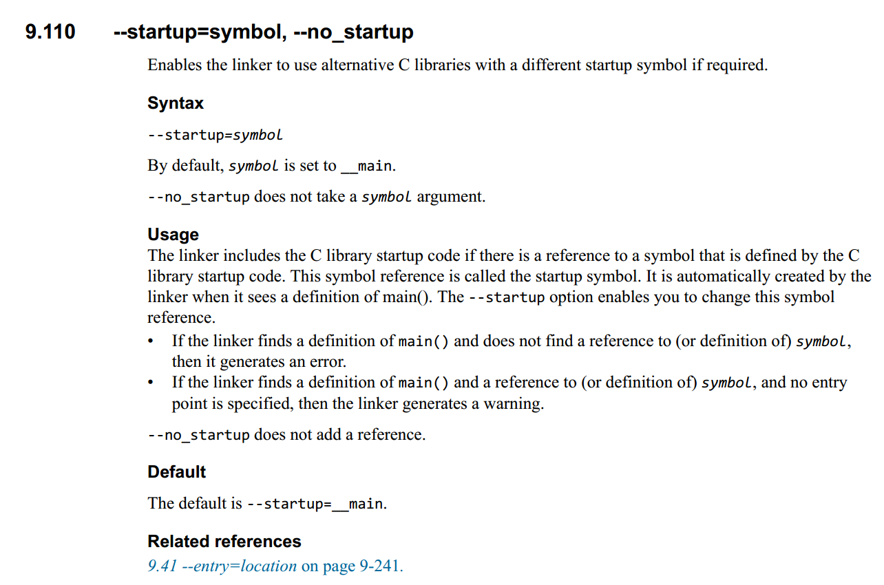 - 大意就是说链接程序时加入--startup=_main选项,MDK在链接程序的时候看到就会自动创建_main。
