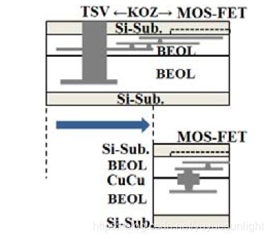 图1: 电路框图关于绑定基层和TSV(上层)和混合绑了定(下层)