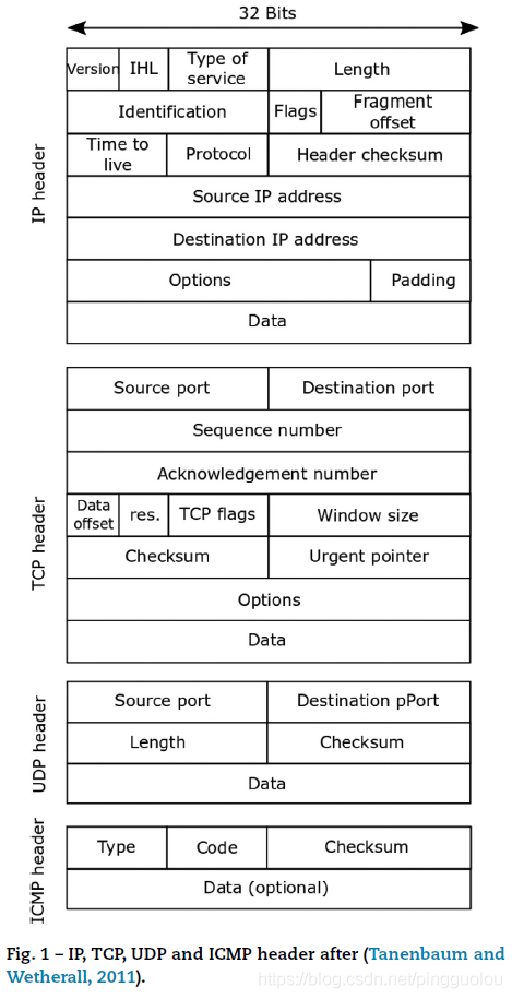 基于数据包的数据通常以pcap格式捕获,包含有效载荷。可用的元数据取决于使用的网络和传输协议。有许多不同的协议,其中最重要的是TCP、UDP、ICMP和IP。图1说明了不同的报头。TCP是一个可靠的传输协议,包括元数据,如序列号、确认号、TCP标志或校验值。UDP是一个无连接的传输协议,它的报头比TCP小,只包含四个字,即源端口、目的端口、长度和校验值。与TCP和UDP相比,ICMP是一个支持性协议,包含状态信息,因此更小。通常,在传输协议的头旁边还有一个IP头。IP头提供了源和目的IP地址等信息,也显示在图1中。