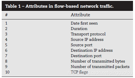 基于流量的网络数据是一种更浓缩的格式,主要包含网络连接的元信息。基于流量的数据将在一个时间窗口内共享某些属性的所有数据包汇总为一个流量,通常不包括任何有效载荷。默认的五元组定义,即源IP地址、源端口、目的IP地址、目的端口和传输协议(Claise,2008),是基于流量的数据中广泛使用的属性匹配标准。流量可以以单向或双向的格式出现。单向格式将所有从主机A到主机B的、具有上述属性的数据包聚合成一个流。所有从主机B到主机A的数据包被聚合成另一个单向流。相比之下,双向流总结了主机A和B之间的所有数据包,无论方向如何。典型的基于流的格式是NetFlow(Claise,2004),IP FIX(Claise,2008),sFlow(Phaal,2004)和OpenFlow(McKeown等人,2008)。表1给出了基于流量的网络流量的典型属性的概述。根据具体的流量格式和流量导出器,可以提取额外的属性,如每秒的字节数、每包的字节数、第一个包的TCP标志,甚至有效载荷的计算熵。此外,有可能通过nfdump 2或YAF等工具将基于数据包的数据转换为基于流量的数据(但反之亦然)。3 对流量输出器之间的差异感兴趣的读者可以在Haddadi和Zincir Heywood(2016)中找到更多细节,以及对不同流量输出器如何影响僵尸网络的分析。