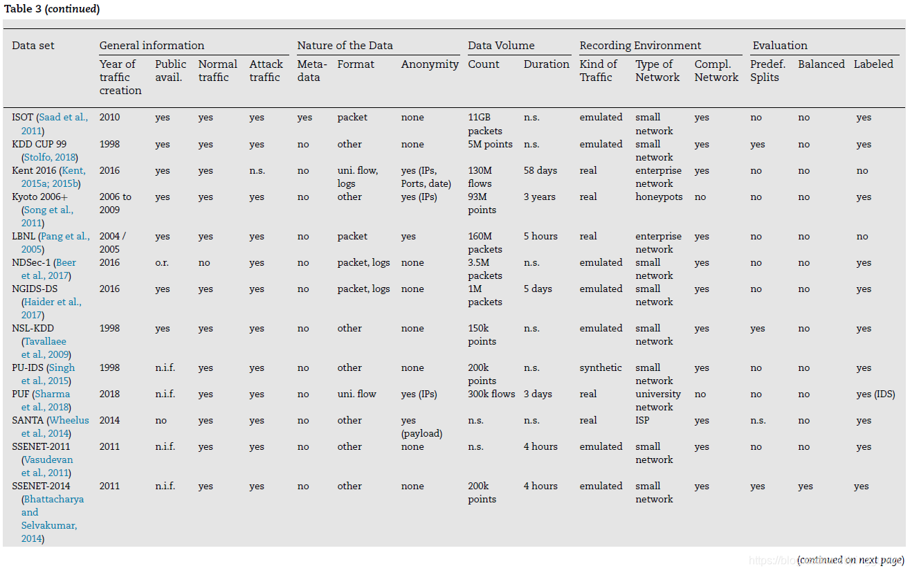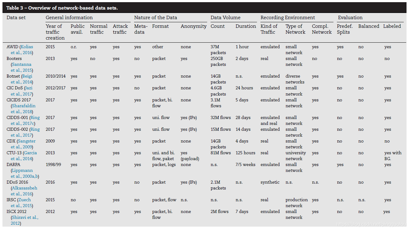 最近的其他论文也涉及到基于网络的数据集,但主要关注点不同。Bhuyan等人(2014)对网络异常检测进行了全面回顾。作者描述了九个现有的数据集,并分析了现有异常检测方法所使用的数据集。同样,Nisioti等人(2018)专注于入侵检测的无监督方法,并简要地提到了12个现有的基于网络的数据集。Yavanoglu和Aydos(2017)分析和比较了最常用的入侵检测数据集。然而,他们的评论只包含7个数据集,包括其他数据集,如HTTP CSIC 2010(Giménez等人,2010)。总而言之,这些作品往往有不同的研究目标,而且只略微涉及到基于网络的数据集。