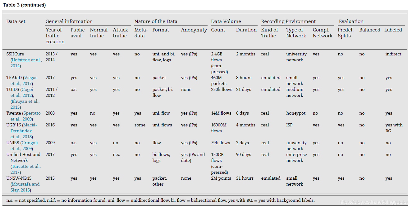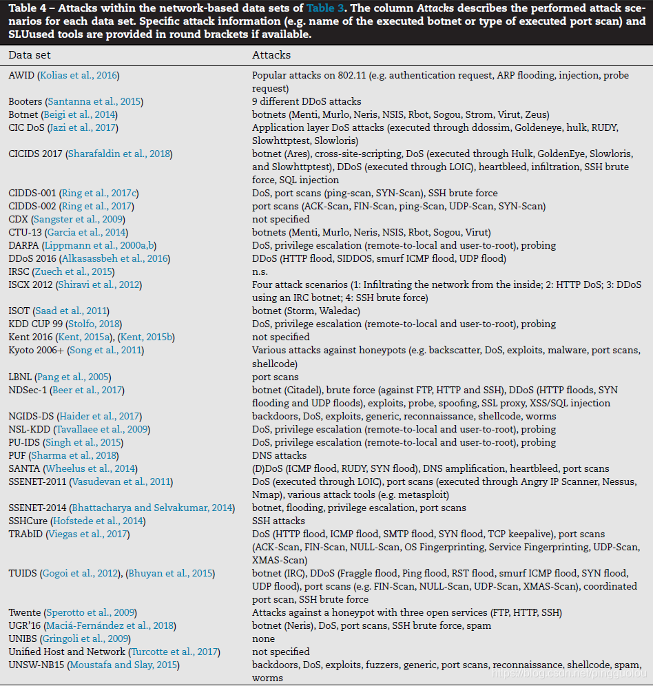 通常,入侵检测数据集可能由于隐私原因而不被公布,或者只以匿名的形式提供。此属性表明数据是否被匿名化,以及哪些属性受到影响。表3中的值no表示没有进行匿名处理。值是(IPs)意味着IP地址被匿名化或从数据集中重新移出。同样地,是(有效载荷)表示有效载荷信息被匿名化或从基于数据包的网络流量中删除。