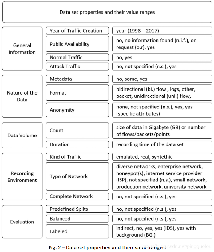 我们没有像Haider等人(2017)或Sharafaldin等人(2018)那样制定一个评价分数,因为我们不想判断不同数据集属性的重要性。在我们看来,某些属性的重要性取决于具体的评价场景,不应该在调查中进行普遍评判。相反,应该让读者能够找到适合他们需要的数据集。因此,我们将下面讨论的数据集属性分为五类,以支持系统的搜索。图2总结了所有的数据集属性和它们的数值范围。