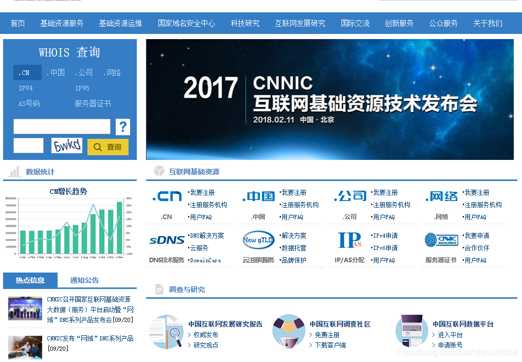 中国互联网络信息中心(China Internet Network Information Center,CNNIC)是经国家主管部门批准,于1997年6月3日组建的管理和服务机构,行使国家互联网络信息中心的职责。CNNIC是我国域名注册管理机构和域名根服务器运行机构。负责运行和管理国家顶级域名.CN、中文域名系统,以专业技术为全球用户提供不间断的域名注册、域名解析和WHOIS查询等服务。CNNIC是亚太互联网络信息中心(APNIC)的国家级IP地址注册机构成员(NIR)。以CNNIC为召集单位的IP地址分配联盟,负责为我国的网络服务提供商(ISP)和网络用户提供IP地址和AS号码的分配管理服务,积极推动我国向以IPv6为代表的下一代互联网发展过渡。CNNIC构建全球领先、服务高效、安全稳定的互联网基础资源服务平台,支撑多层次、多模式公益的互联网基础资源服务,积极寻求我国网络基础资源核心能力和自主工具的突破,从根本上提高我国网络基础资源体系的可信、安全和稳定。CNNIC负责开展中国互联网络发展状况等多项互联网络统计调查工作,描绘中国互联网络的宏观发展状况,忠实记录其发展脉络。CNNIC一方面将继续加强对国家和政府的政策研究支持,另一方面也会为企业、用户、研究机构提供互联网发展的公益性研究和咨询服务。CNNIC积极跟踪互联网政策和技术的最新发展,与相关国际组织以及其他国家和地区的互联网络信息中心进行业务协调与合作。承办国际重要的互联网会议与活动,构建开放、共享的研究环境和国际交流平台。促进科研成果转化和孵化,服务中国互联网事业发展。里面对老百姓有用的一个模块,各种统计数据