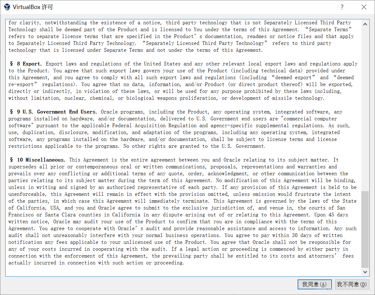 用鼠标把VitualBox许可的滚动条往下拉动,到达最后面,点击我同意。
