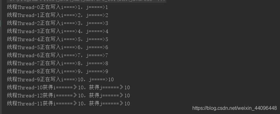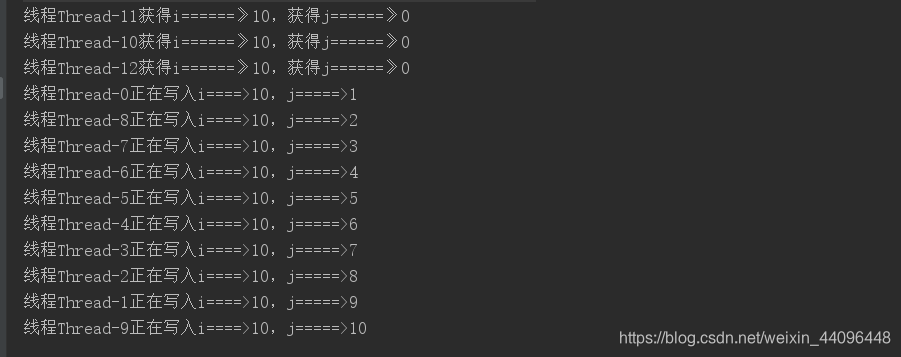 public class StampedLockDemo {private int i = 0;private int j = 0;private static final StampedLock stampedLock = new StampedLock();public void readMethod() {// 获取读锁long readLock = stampedLock.readLock ();try {System.out.println (String.format ("线程%s获得i======》%d,获得j======》%d", Thread.currentThread ().getName (), i, j));} finally {// 释放读锁stampedLock.unlockRead (readLock);}}public void writeMethod() {// 获取写锁long writeLock = stampedLock.writeLock ();try {i++;j++;System.out.println (String.format ("线程%s正在写入i====>%d,j=====>%d", Thread.currentThread ().getName (), i, j));} finally {// 释放写锁stampedLock.unlockWrite (writeLock);}}public static void main(String[] args) {StampedLockDemo stampedLockDemo = new StampedLockDemo ();for (int i = 0; i < 10; i++) {new Thread (() -> {stampedLockDemo.writeMethod ();}).start ();}for (int j = 0; j < 3; j++) {new Thread (() -> {stampedLockDemo.readMethod ();}).start ();}}}