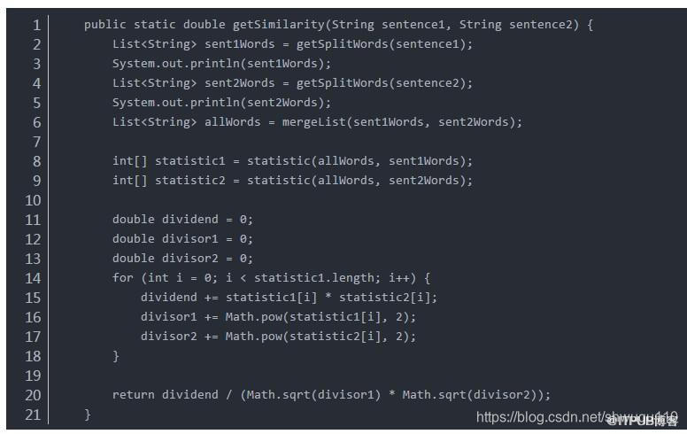 package com.yuantu.dubbo.provider.questionRepo.utils;import com.hankcs.hanlp.HanLP;import com.hankcs.hanlp.dictionary.CustomDictionary;import org.jsoup.Jsoup;import java.util.ArrayList;import java.util.Calendar;import java.util.Collections;import java.util.List;import java.util.stream.Collectors;public class SimilarityUtil {static {CustomDictionary.add(" 子类 ");CustomDictionary.add(" 父类 ");}private SimilarityUtil() {}/*** 获得两个句子的相似度** @param sentence1* @param sentence2* @return*/public static double getSimilarity(String sentence1, String sentence2) {List<String> sent1Words = getSplitWords(sentence1);System.out.println(sent1Words);List<String> sent2Words = getSplitWords(sentence2);System.out.println(sent2Words);List<String> allWords = mergeList(sent1Words, sent2Words);int[] statistic1 = statistic(allWords, sent1Words);int[] statistic2 = statistic(allWords, sent2Words);double dividend = 0;double divisor1 = 0;double divisor2 = 0;for (int i = 0; i < statistic1.length; i++) {dividend += statistic1[i] * statistic2[i];divisor1 += Math.pow(statistic1[i], 2);divisor2 += Math.pow(statistic2[i], 2);}return dividend / (Math.sqrt(divisor1) * Math.sqrt(divisor2));}private static int[] statistic(List<String> allWords, List<String> sentWords) {int[] result = new int[allWords.size()];for (int i = 0; i < allWords.size(); i++) {result[i] = Collections.frequency(sentWords, allWords.get(i));}return result;}private static List<String> mergeList(List<String> list1, List<String> list2) {List<String> result = new ArrayList<>();result.addAll(list1);result.addAll(list2);return result.stream().distinct().collect(Collectors.toList());}private static List<String> getSplitWords(String sentence) {// 去除掉 html 标签sentence = Jsoup.parse(sentence.replace(" ","")).body().text();// 标点符号会被单独分为一个 Term ,去除之return HanLP.segment(sentence).stream().map(a -> a.word).filter(s -> !"`~!@#$^&*()=|{}':;',\\[\\].<>/?~ ! @# ¥…… &* ()—— |{} 【】‘;:”“ ' 。,、? ".contains(s)).collect(Collectors.toList());}}