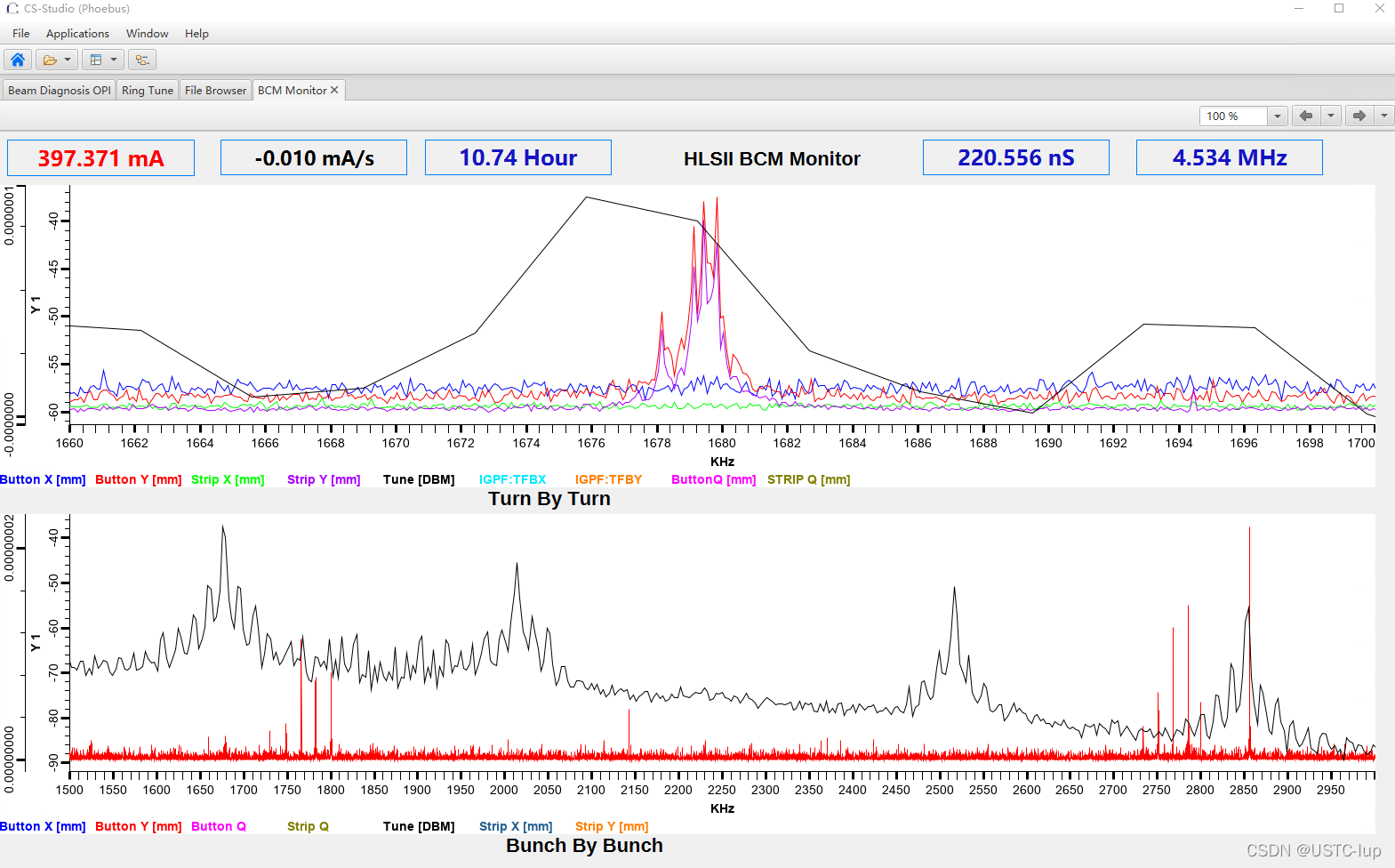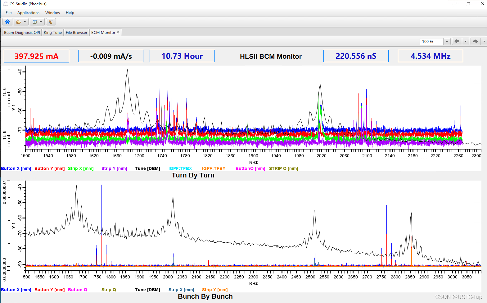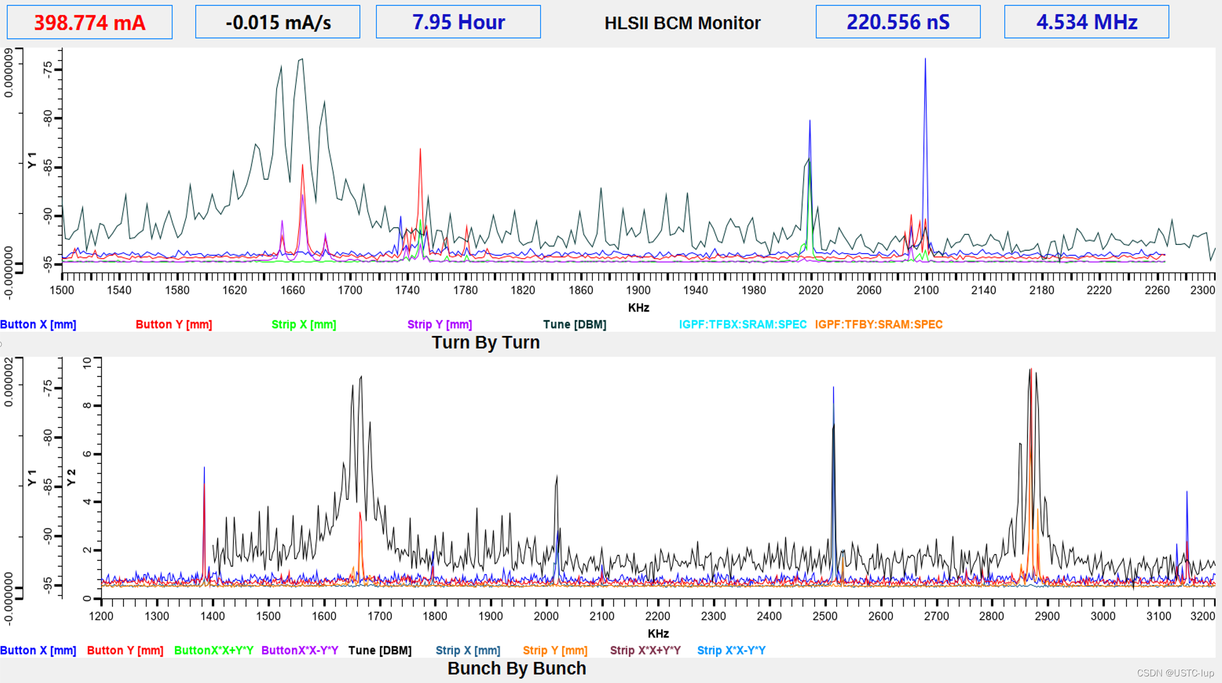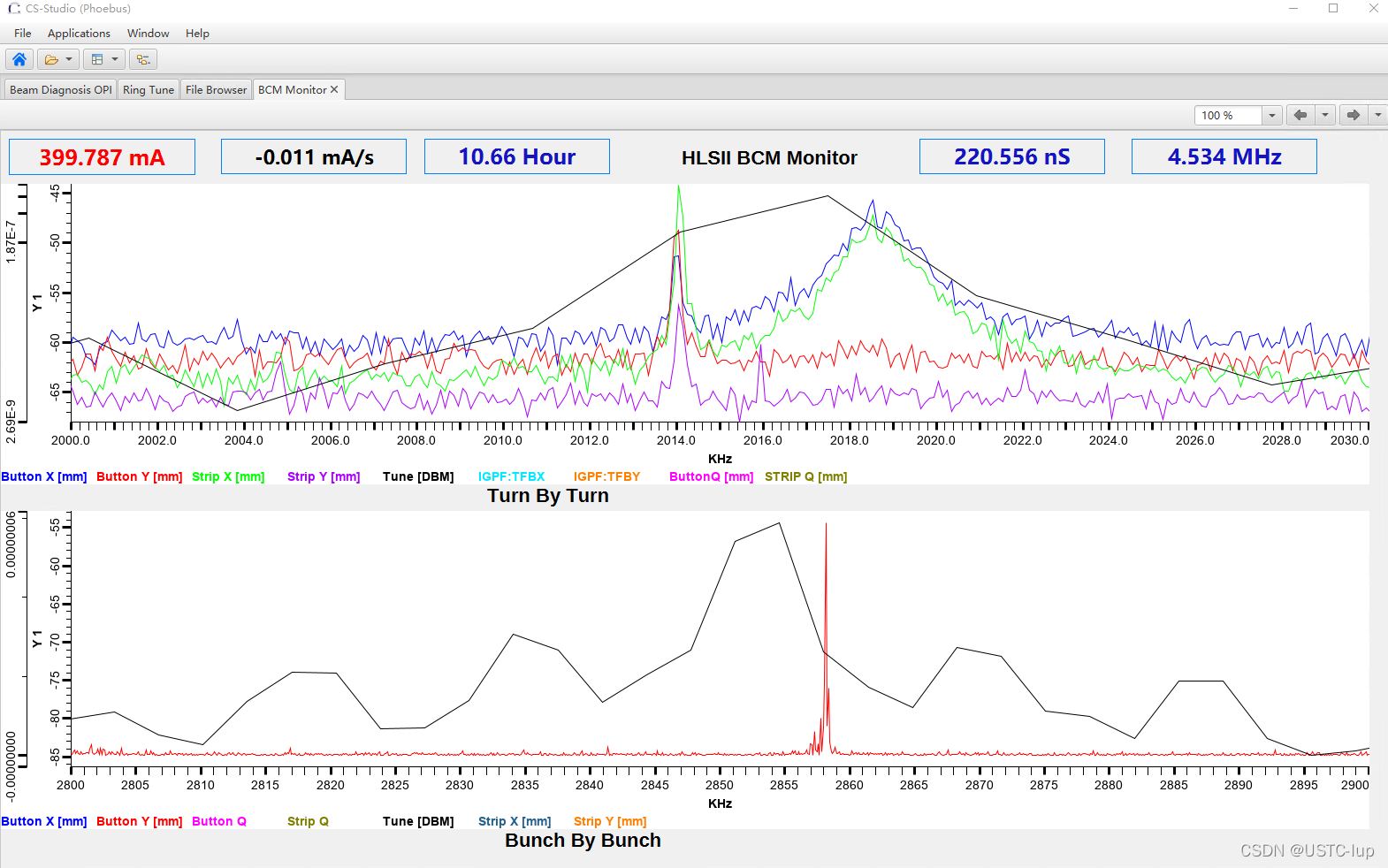 以前在上篇文里贴的X、Y频谱工作点谱峰的图,那时候还是500us的波形,分辨率是2KHz的谱线,后来10ms的波形,谱线的分辨率可达到100Hz,看工作点的谱峰就更加精细了: