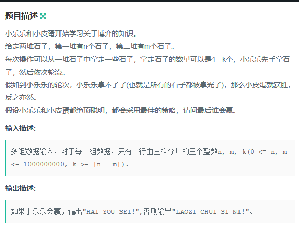 那么好了 这个题 由于k的范围限制 导致先手的人一定可以把两堆变成一样多 从而轮到对手取拿 对手必输
