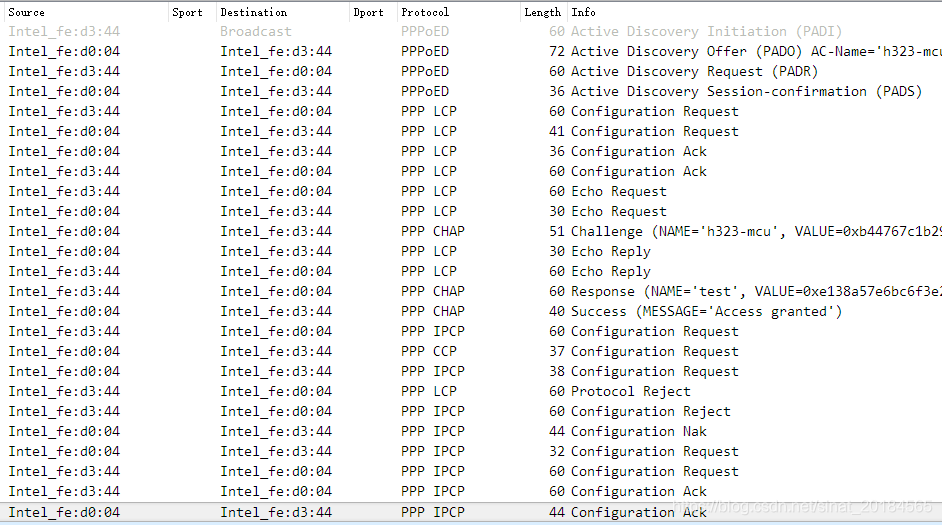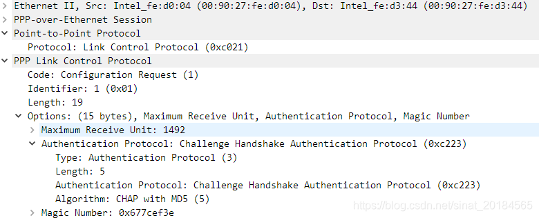 其后为典型的PPP协商数据包。LCP协商认证方式与压缩算法等:
