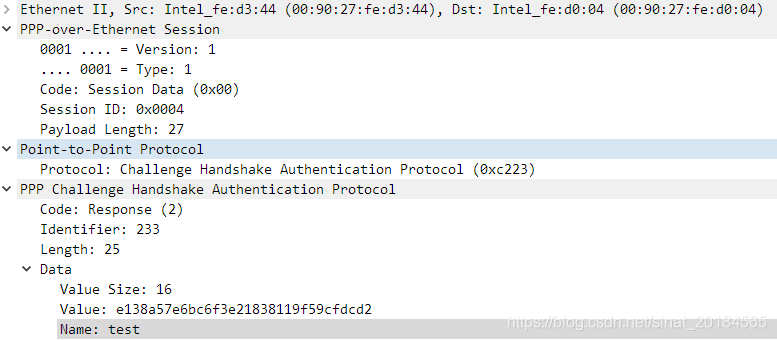 客户端的认证过程由3个PPP CHAP数据包完成(我们配置使用CHAP方式认证),PPPoE服务端发送CHAP Challenge数据包到客户端,客户端基于test用户的密码对Challenge数据进行hash计算,将结果返回给服务端,服务端验证一致性,返回认证成功给客户端,即最后一个PPP CHAP报文(Access granted),第二个客户端发往服务端的交互报文携带明文的用户名称(test),存在泄漏风险。