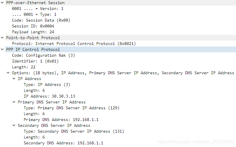 最后看一下IPCP Nak报文,其传输分配给客户端的IP地址(30.30.3.13)与DNS配置信息(192.168.1.1)。