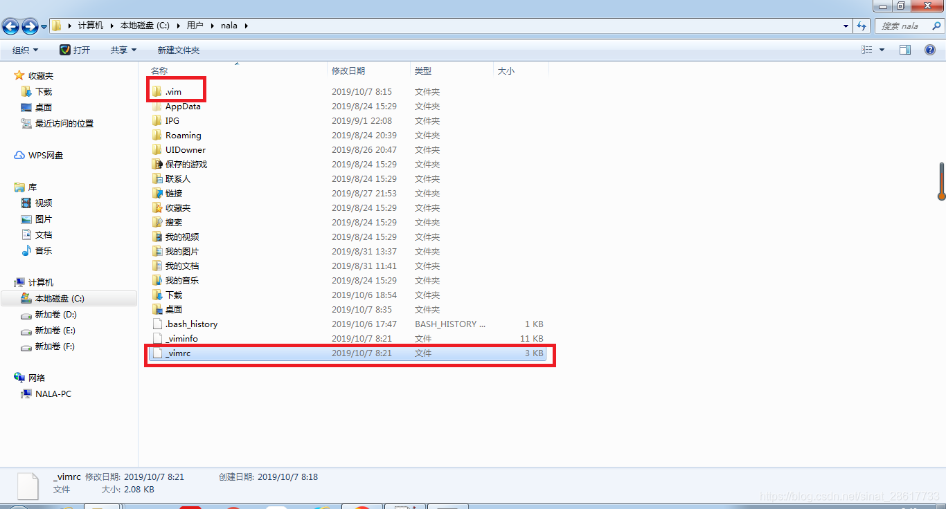 C:\Users\nala(用户名),这个目录下生成$HOME目录,把里面的.vim文件夹复制到C:\Users\nala目录,然后从家目录中就可以加载vundle插件了(提前提醒一下,_vimrc中rtp是 set rtp+=.vim\bundle\Vundle.vim\ 然后_vimrc就从家目录中找到vundle插件了),到这里下面红色圈中显示的文件夹(.vim)和文件(_vimrc)存在就可以了,如果没有_vimrc,使用记事本创建_vimrc,没有扩展名,内容添加下面代码段: