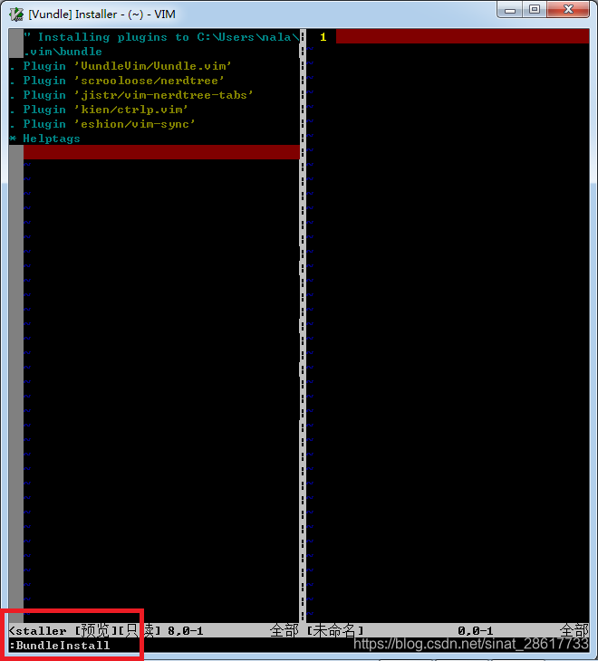 然后打开vim,normal模式下执行:BundleInstall,展示下图: