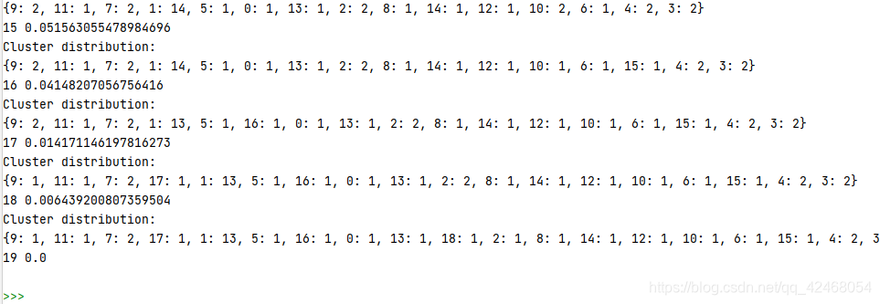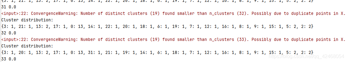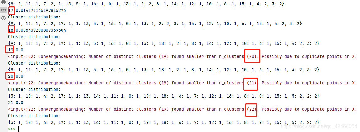运行不会出现“ConvergenceWarning: Number of distinct clusters (19) found smaller than n_clusters (20).”红色字样