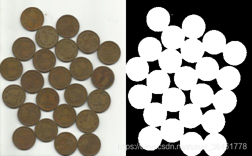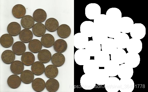下面我们将看到一个使用距离变换和分水岭来分割相互接触的物体的示例。考虑下面的硬币图像,硬币互相接触。即使你达到阈值,它也会相互接触。我们首先找到硬币的近似估计值。为此,我们可以使用Otsu的二值化。