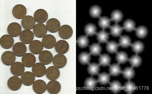 在阈值图像中,我们得到了一些我们确定硬币的硬币区域,现在它们已经分离。(在某些情况下,你可能只对前景分割感兴趣,而不是分离相互接触的物体。在这种情况下,你不需要使用距离变换,只需要侵蚀就足够了。侵蚀只是提取确定前景区域的另一种方法,那就是所有)