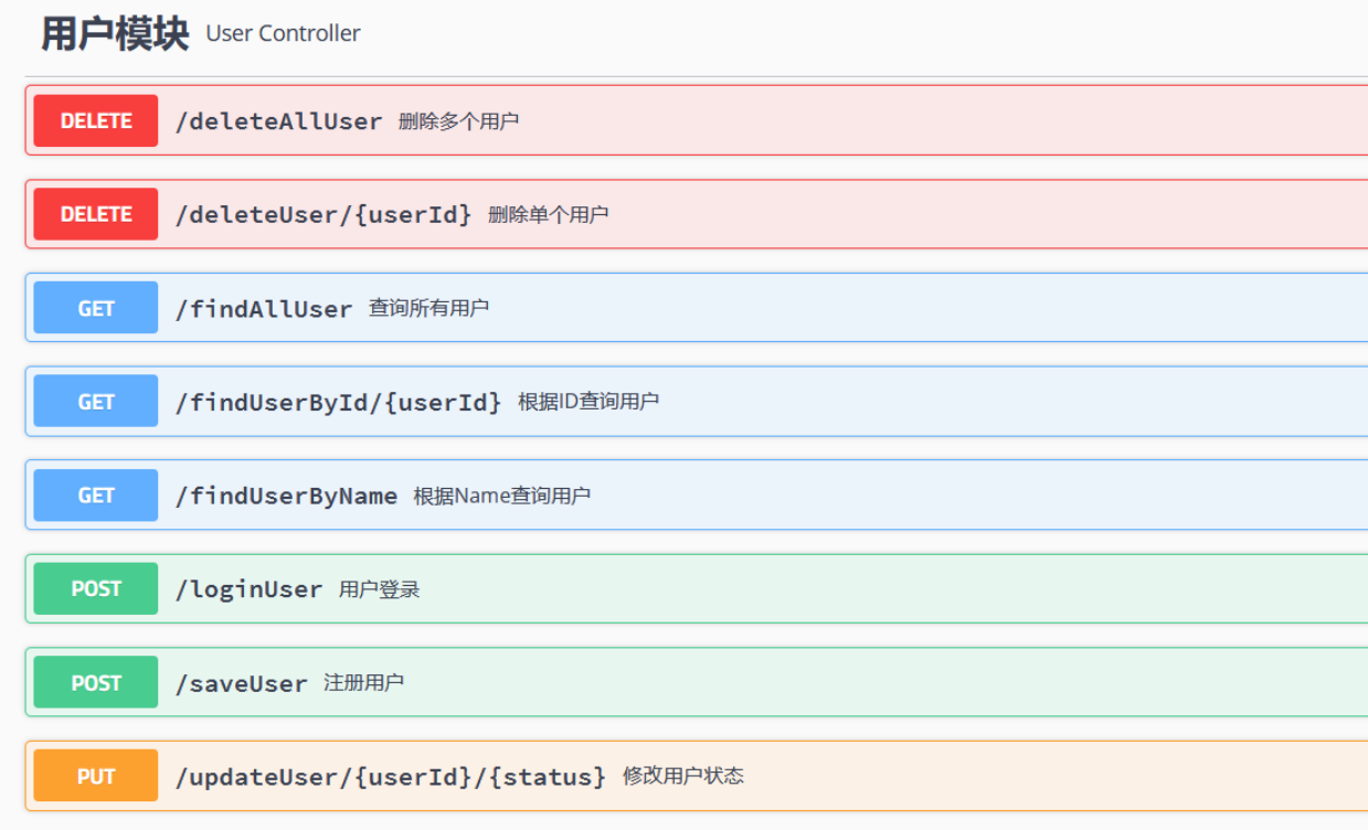 public class UserController {@Autowiredprivate UserService service;//添加用户@ApiOperation(value="注册用户",notes="传递一个json格式的用户对象的字符串")@PostMapping("/saveUser")public Result addUser(@RequestBody User user) {service.saveOrUpdateUser(user);return Result.success(user);}//根据ID查询用户信息@ApiOperation(value = "根据ID查询用户",notes = "要查询的用户ID")@ApiImplicitParams(@ApiImplicitParam(name = "ID",value = "用户ID"))@GetMapping("/findUserById/{userId}")public Result findUserById(@PathVariable("userId") Long userId) {//调用service层方法完成注册的业务逻辑User user = service.findUserById(userId);if(user==null) {throw new ServiceException(ResultCode.USER_NOT_EXIST);}return Result.success(user);}//根据用户名查询用户@ApiOperation(value = "根据Name查询用户",notes = "要查询的用户名")@ApiImplicitParams(@ApiImplicitParam(name = "name",value = "用户名"))@GetMapping("/findUserByName")public Result findUserByName(String name) {//调用service层方法完成注册的业务逻辑User user = service.findUserByUsername(name);if(user==null) {throw new ServiceException(ResultCode.USER_NOT_EXIST);}return Result.success(user);}//查询所有的用户信息@ApiOperation(value="查询所有用户",notes = "不需要传入参数")@GetMapping("/findAllUser")public Result findAllUser(){Page<User> page = service.getAll(0, 3);return Result.success(page);}//根据ID删除单个用户信息@ApiOperation(value = "删除单个用户",notes = "被删除用户的ID")@DeleteMapping("/deleteUser/{userId}")public Result deleteUserById(@PathVariable("userId") Long userId) {service.deleteUserById(userId);return Result.success("删除成功");}//根据ID删除多个用户信息@ApiOperation(value = "删除多个用户",notes = "被删除用户的ID(集合或数组格式的字符串)")@DeleteMapping("/deleteAllUser")public Result deleteUser(@RequestBody List<Long> ids) {service.deleteUserInBatch(ids);return Result.success("删除成功");}//根据ID修改用户的状态@ApiOperation(value = "修改用户状态",notes = "要修改的用户ID")@PutMapping("/updateUser/{userId}/{status}")public Result updateUserById(@PathVariable("userId") Long userId,@PathVariable("status") String status) {service.updateUserStatus(userId,status);return Result.success("更新成功");}//用户登录@ApiOperation(value = "用户登录",notes = "输入用户名和密码")@PostMapping("/loginUser")public Result loginUser(String username,String password) {User user = service.login(username, password);if(user==null||!user.getPassword().equals(password)) {throw new ServiceException(ResultCode.USER_LOGIN_ERROR);}//判断用户状态(正常/禁用)if(user.getStatus().equals("1")) {throw new ServiceException(ResultCode.USER_STATUS_ERROR);}return Result.success(user);}