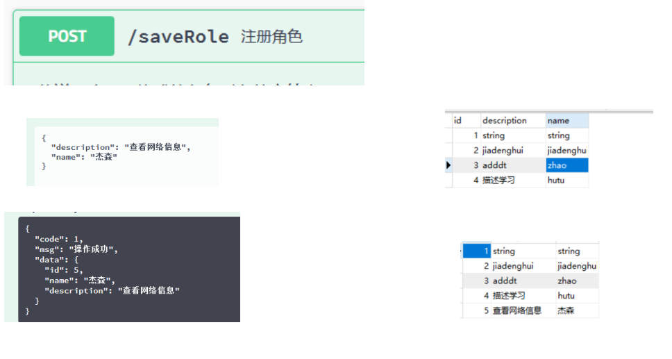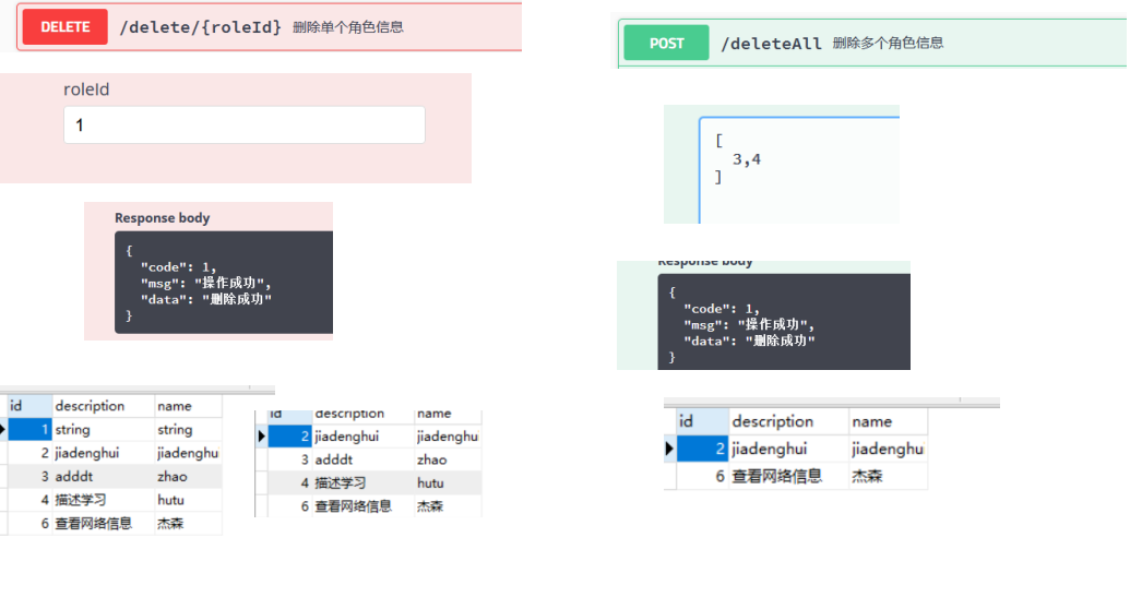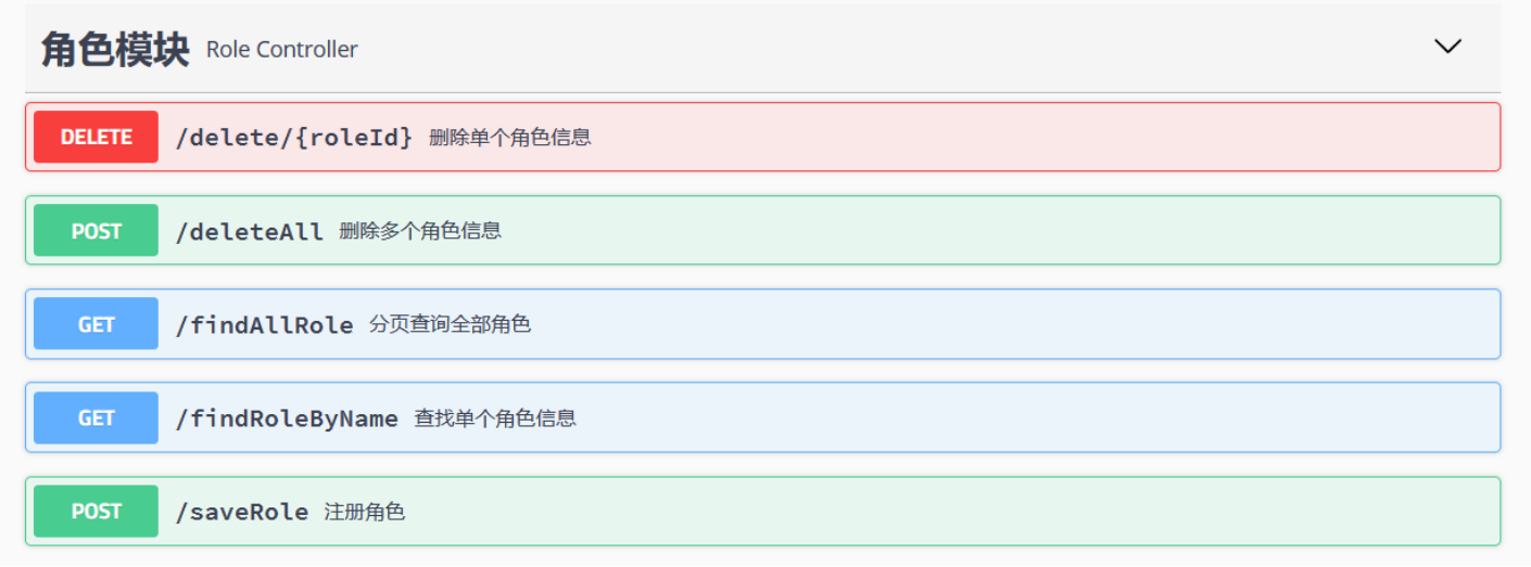 public class RoleController {@Autowiredprivate RoleService service;//注册一个角色@ApiOperation(value = "注册角色",notes = "传递一个json格式的角色对象的字符串")@PostMapping("/saveRole")public Result saveRole(@RequestBody Role role) {//调用service层方法完成注册的业务逻辑service.saveOrUpdateRole(role);return Result.success(role);}//根据角色名称查找具体的角色信息@ApiOperation(value = "查询角色",notes = "传递一个字符串型的角色名称")@ApiImplicitParams(@ApiImplicitParam(name = "name",value = "角色名称"))@GetMapping("/findRole")public Result findRoleByName(String name) {//调用service层方法完成注册的业务逻辑Role role = service.findRoleByName(name);if(role==null) {throw new ServiceException(ResultCode.USER_NOT_EXIST);}return Result.success(role);}// 查找全部的用户信息@ApiOperation(value = "分页查询全部角色",notes = "一个整数类型的页码数")@ApiImplicitParams({@ApiImplicitParam(value = "需要查看第几页的内容",name = "pageIndex")})@GetMapping("/findAllRole")public Result findAllRole(int pageIndex) {Page<Role> page =service.findAll(pageIndex, 1);return Result.success(page);}//通过ID删除单个角色信息@ApiOperation(value = "删除单个角色信息",notes = "传递被删除角色的ID")@DeleteMapping("/delete/{roleId}")public Result deleteRoleById(@PathVariable("roleId") Long roleId) {service.deleteRoleById(roleId);return Result.success("删除成功");}//通过ID删除多个角色信息@ApiOperation(value = "删除多个角色信息",notes = "传递被删除角色的ID(集合或者数组格式的字符串)")@DeleteMapping("/deleteAll")public Result deleteRole(@RequestBody List<Long> ids) {System.out.println(ids);service.deleteRoleInBatch(ids);return Result.success("删除成功");}
