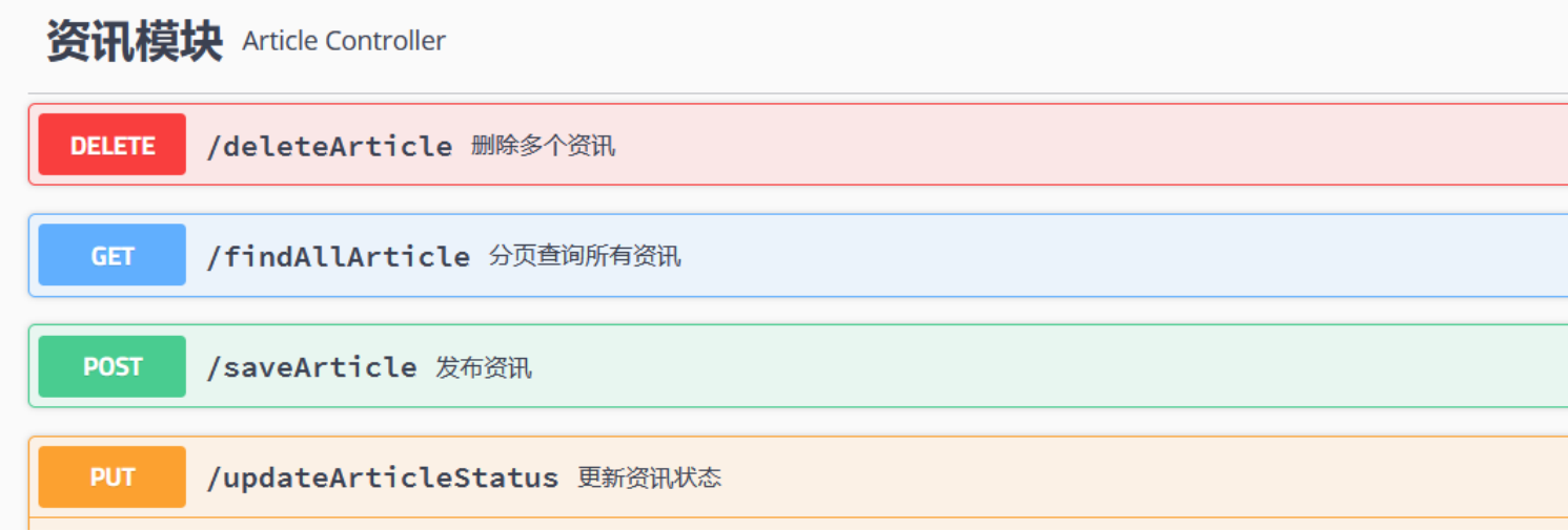 public class ArticleController {@Autowiredprivate ArticleService service;//发布资讯或者编辑资讯@ApiOperation(value = "发布资讯",notes = "传递一个json格式的资讯对象的字符串")@PostMapping("/saveArticle")public Result saveArticle(@RequestBody Article article) {service.saveOrUpdateArticle(article);return Result.success(article);}//分页查询所有资讯@ApiOperation(value = "分页查询所有资讯",notes = "不需要参数")@GetMapping("/findAllArticle")public Result findAllArticle() {Page<Article> page = service.findAll(0, 10);return Result.success(page);}//根据ID删除多个资讯信息@ApiOperation(value = "删除多个资讯",notes = "输入被删除的资讯ID(集合或者数组类型的字符串)")@DeleteMapping("/deleteArticle")public Result deleteArticle(@RequestBody List<Long> ids) {service.deleteArticleInBatch(ids);return Result.success("删除成功");}//更新资讯状态(未审核0,审核通过1,审核失败2)@ApiOperation(value = "更新资讯状态",notes = "输入要更新状态的资讯ID")@PutMapping("/updateArticleStatus")public Result updateArticleStatus(Long id,String status) {service.updateArticleStatus(id, status);return Result.success("更新状态成功");}//根据资讯id查找资讯的所有评论,并分页显示评论}