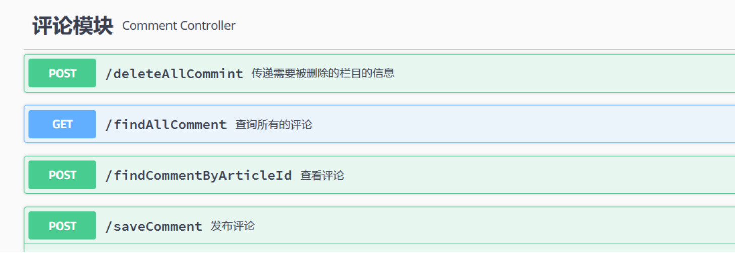 public class CommentController {@Autowiredprivate CommentService service;//分页获取所有评论@ApiOperation(value = "查询所有评论",notes = "不需要输入参数")@GetMapping("/findAllComment")public Result findAllComment() {Page<Comment> cm = service.findAll(0, 5);return Result.success(cm);}//新增评论或者更新评论@ApiOperation(value = "添加评论",notes = "传递一个json格式的评论对象的字符串")@PostMapping("/saveComment")public Result saveComment(@RequestBody Comment comment) {service.saveOrUpdateComment(comment);return Result.success("添加成功");}//批量删除评论@ApiOperation(value = "删除多个评论",notes = "输入被删除的评论ID(集合或数组类型的字符串)")@DeleteMapping("/deleteAllComment")public Result deleteComment(@RequestBody List<Long> ids) {service.deleteCommentInBatch(ids);return Result.success("删除成功");}//根据资讯id分页获取所有评论}