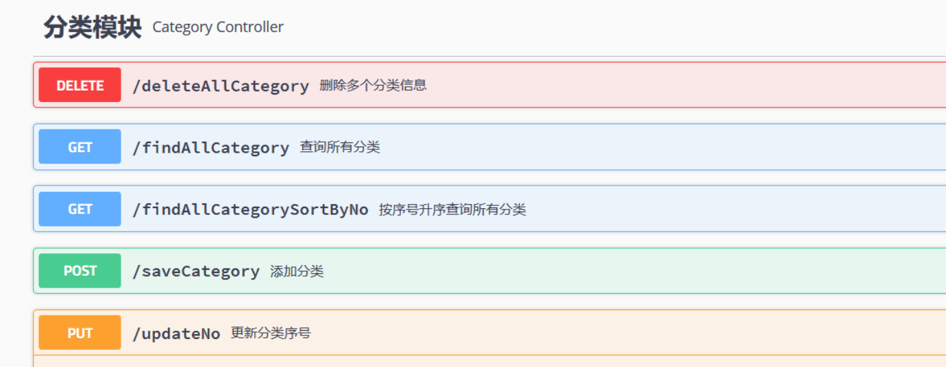 public class CategoryController {@Autowiredprivate CategoryService service;//查询所有分类@ApiOperation(value = "查询所有分类",notes = "不需要输入参数")@GetMapping("/findAllCategory")public Result findAllCategory() {Page<Category> ct = service.findAll(0, 3);return Result.success(ct);}//添加分类@ApiOperation(value = "添加分类",notes = "传递一个json格式的分类对象的字符串")@PostMapping("/saveCategory")public Result saveCategory(@RequestBody Category category) {service.saveOrUpdateCategory(category);return Result.success("添加成功");}//根据ID删除多个分类信息@ApiOperation(value = "删除多个分类信息",notes = "输入被删除的分类ID(集合或数组类型的字符串)")@DeleteMapping("/deleteAllCategory")public Result deleteCategory(@RequestBody List<Long> ids) {service.deleteCategoryInBatch(ids);return Result.success("删除成功");}//按序号升序查询所有分类,并进行分页@ApiOperation(value = "按序号升序查询所有分类",notes = "不需要输入参数")@GetMapping("/findAllCategorySortByNo")public Result findAllCategorySortByNo() {Page<Category> page = service.findAllSortbyno(0, 5);return Result.success(page);}//更新分类的序号@ApiOperation(value = "更新分类序号",notes = "需要更新序号的分类ID")@PutMapping("/updateNo")public Result updateCategoryNo(Long id,int no) {service.updateCategoryNo(id, no);return Result.success("更新成功");}