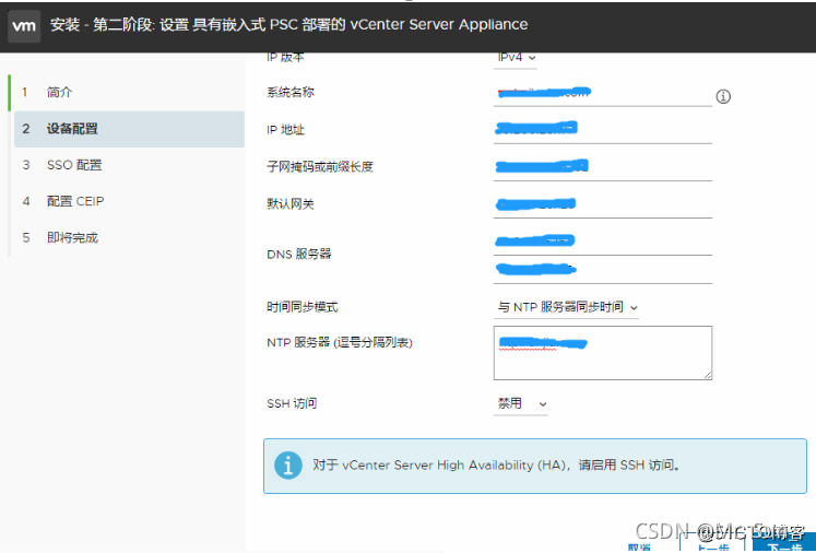 2.配置设备中的时间设置,对设备启用远程 SSH 访问(可选),然后单击下一步。