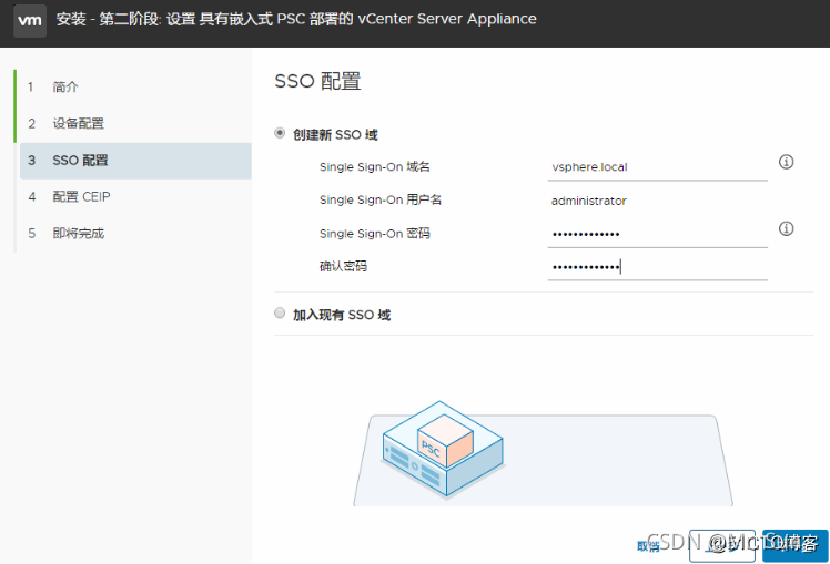 3.创建一个新的 vCenter Single Sign-On 域或加入现有域。
