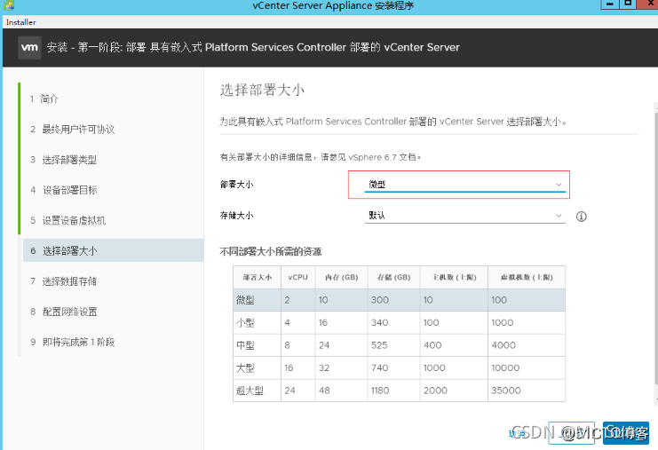 5.为 vSphere 清单选择 vCenter Server Appliance 的部署大小。