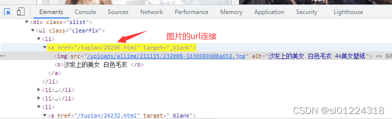 首先我么打开浏览器开发者工具,找到图片的url连接,经过分析可知,图片的url连接在li标签下面的href属性中,我们点开该链接就可以跳转到图片详情中去,但是这里需要注意的是,href属性内容只是url链接的一部分,我们需要对其进行拼装使其组成一个完整的url。
