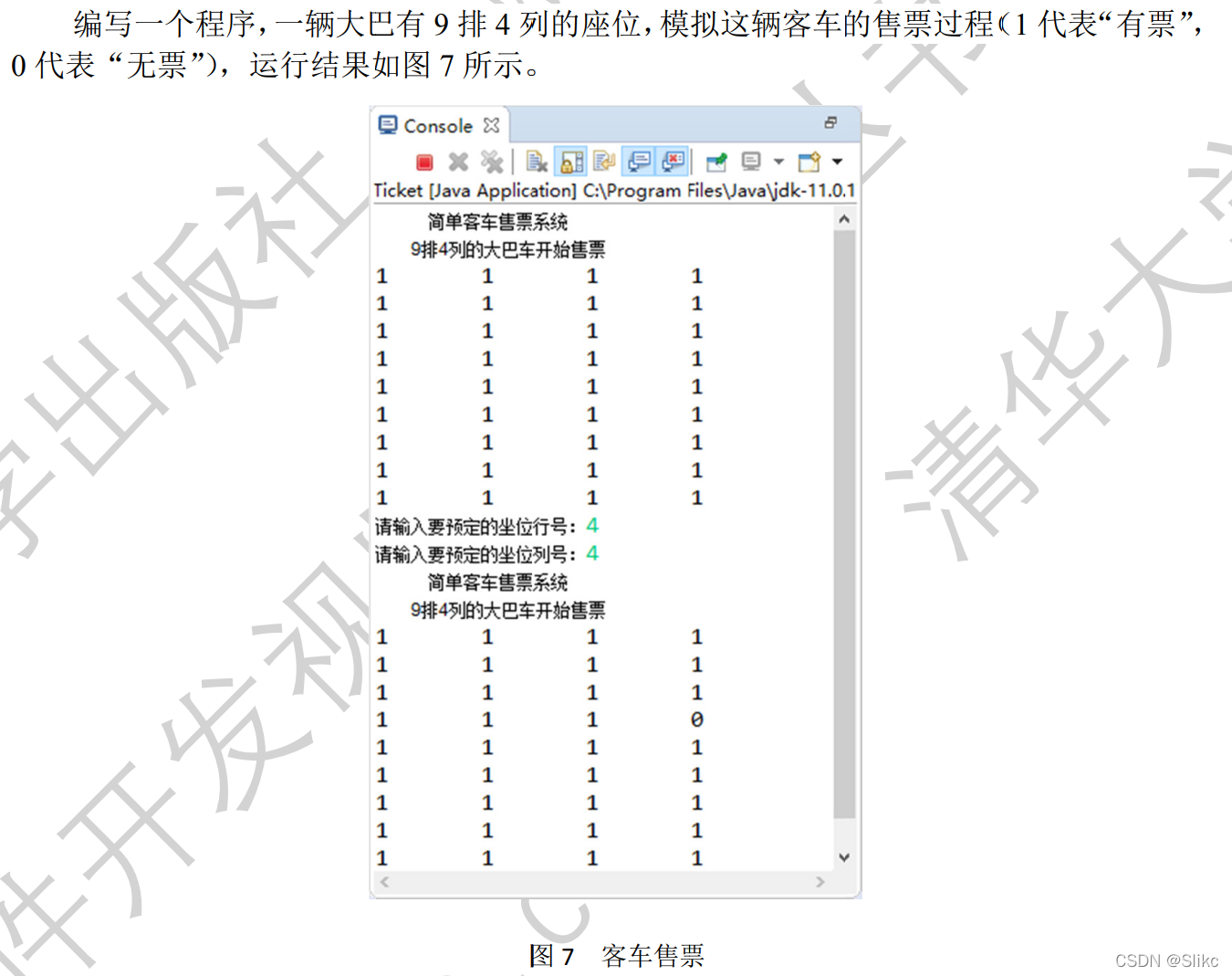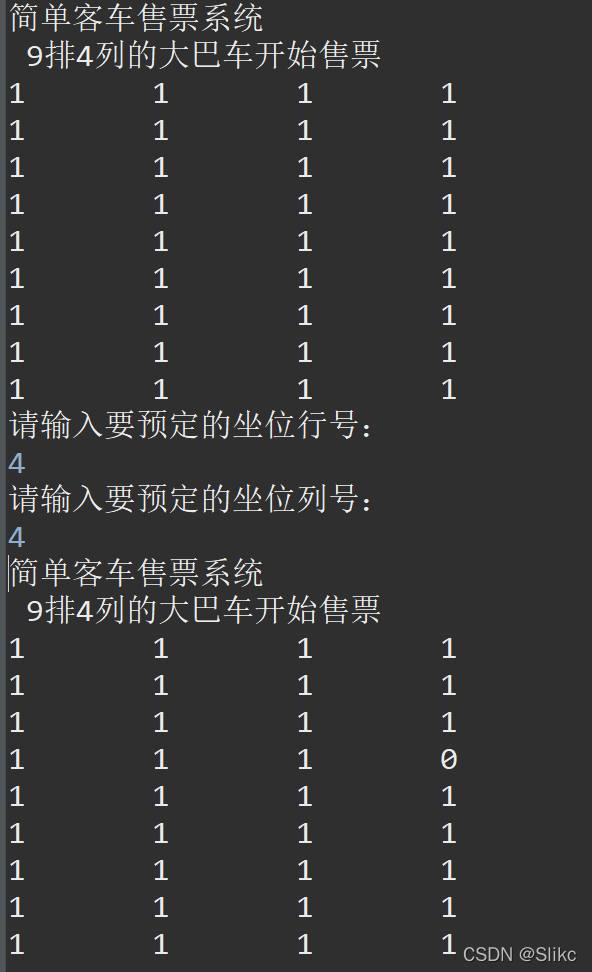 public class Kecheshoup { //创建Kecheshoup类public static void main(String[] args) { // 主函数int zuo[][] = new int[9][4]; // 定义二维数组for (int i = 0; i < 9; i++) { // for循环开始for (int j = 0; j < 4; j++) { // for循环开始zuo[i][j] = 1; // 初始化二维数组}}while (true) { // 开始售票System.out.println(" 简单客车售票系统" + "\n 9排4列的大巴车开始售票");// 输出标题for (int i = 0; i < 9; i++) { //外循环for (int j = 0; j < 4; j++) { // 内循环System.out.print(zuo[i][j] + "\t"); // 输出售票信息}System.out.println(); // 输出换行符}// 创建扫描器,用来进行用户输入Scanner sc = new Scanner(System.in);// 提示用户输入信息System.out.println("请输入要预定的坐位行号:");// 提示用户输入信息int row = sc.nextInt(); // 得到坐位行数System.out.println("请输入要预定的坐位列号:");// 提示用户输入信息int column = sc.nextInt(); // 得到坐位列数zuo[row - 1][column - 1] = 0; // 标记售出票状态}}